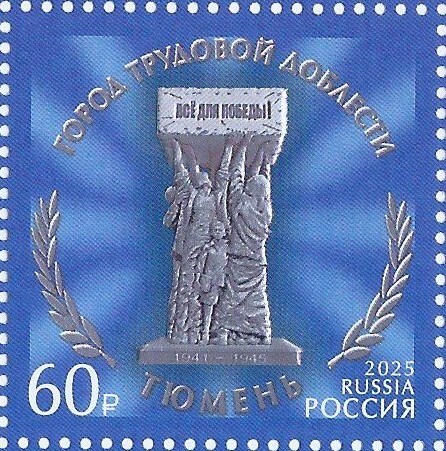 Марка с видом памятника Труженикам тыла Тюменской области, созданного авторским коллективом под руководством Сергея Титлинова в 2010 г в Тюмени. Марка выпущена в 2025 году в каталоге "Города трудовой доблести" ФГУП Марка и распространяется по сети магазинов ФГУП Марка.